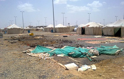 وصلت إيلاف إلى داخل المخيمات الخاصة بالنازحين التي أحيطت بسياج منعا للتسلل إليها إلا من خلال تصاريح أعدتها إدارة الدفاع المدني للعبور من بوابتها، أثناء الجولة سيرًا على الأقدام ومررنا بالعديد من المخيمات التي ارتسم عليها شعار (السعودية مملكة الإنسانية) استوقف الجولة بعض ركام من رماد بأقصى الشمال من المخيم اتضح بعد السؤال أن حريقًا شب ببضع من الخيام السبت الماضي دون حدوث أي أضرار بشرية في صفوف النازحين.