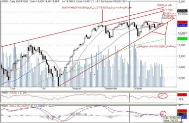 عند هذا المستوى ظل المؤشر يتراوح ما بين 14000 و 15000 نقطة حتى كون المؤشر مثلثا بتاريخ 12/10/2005م . هذا المثلث واضح جدا في الرسم البياني المرفق فأول قمة له هي (15137) تلتها قمة أخرى بتاريخ 13/10/2005م وهي (15134) ثم قاع في تاريخ 17/10/2005م بلغ (14460) نقطة و أستمر هذا التذبذب 23/10/2005م . عند هذا التاريخ كان على المؤشر إما أن يكسر ضلع الدعم أو يتجاوز ضلع المقاومة ويسير في الإتجاه الصاعد وهو ما حدث فعلاًَ حيث تجاوز المؤشر ضلع المقاومة ليصل إلى (15619) ولله الحمد .