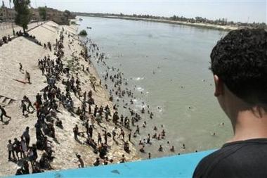 سيارات الاسعاف تشق طريقها وسط الحشود إسعاف رجل بعد انهيار الحسر مباشرة يسارعون لانقاذ من سقط في النهر