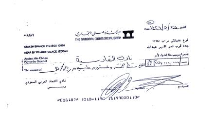 صورة من شيك نادي الإتحاد لإدارة القادسية