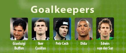 -حراسة المرمى ... بوفون (ايطاليا / اليوفنتوس) ndash; كاسياس (اسبانيا / ريال مدريد) ndash; بيتر تشك (جمهورية التشيك / تشلسي) ndash; ديدا (البرازيل / ايه سي ميلان) ndash; فان دير سار (هولندا / مانشستر يونايتد)