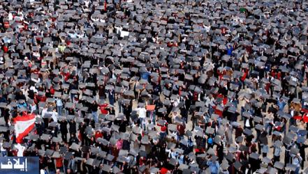 اسفل المسجد كانت الحشود تقف بانتظام وتتجمع، مظاهرات صغيرة من مئات المشاركين بدأت تظهر، لم يبدو ان هناك نقص في التنظيم رغم سرعة الاعداد، كان شبان متطوعون من كافة الاطراف المعارضة تتولى عملية ادارة المجموعات البشرية وتوجيهها، لتعبئة الرسم بشكل متوازن.