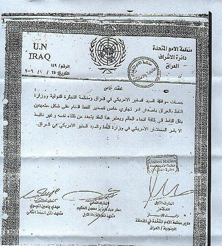 حصلت موافقة السيد السفير الاميركي في العراق ومنظمة التجارة الدولية ووزارة النفط بالعراق باصدار امر تجاري خاص لتصدير النفط الخام على شكل متعهدين بنقل النفط الى كافة انحاء العالم ويعتبر هذا العقد يتجدد من تلقاء نفسه وغير نافذ الا بأمر المستشار الاميركي في وزارة النفط والسيد السفير الاميركي في العراق .