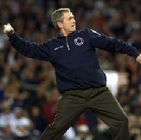 &ثم ردد الجمهور "الولايات المتحدة، الولايات المتحدة" بينما صافح بوش مدربي الفريقين المتنافسين، يانكي النيويوركي حامل اللقب ودياموند باكس من اريزونا.