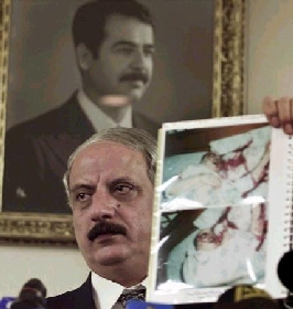 بغداد، في عرف الولايات المتحدة التي تجهز ضربة عسكرية لإطاحة الحكم القائم فيها تحاول مغازلة الغرب للتنازل عن خطط الضربة المحققة ولذا فهي تقدم رأس "المرحوم اساسا بمرض السرطان على حلبة مذبحة سومرية حسب الادبيات المعتادة في بلاد الرافدين".