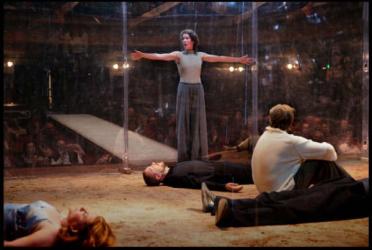 لقد احاط المخرج الخشبة بزجاج شفاف وجعله أشبه بقفص كبير له مداخل من الجانبين وهي عكس مداخل المدرجات التي بناها على المسرح ونرى بداخل القفص أجاممنون، اورستيس،افجينيا ،ايجستيوس وكليتمنسترا نائمون جميعا على الأرض وكأنهم جثث! كليتمنسترا تتوسد صحن زجاجي فارغ وهي علامة رائعة فيها إحالة ذكية للوليمة التي عملها اتريو