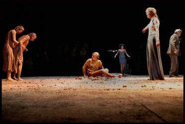 الوحل هو العار الذي التصق بتاريخ عائلة ال اتريوس وان تعاقبت الاجيال ، يبقى تحمله الاجيال معها وكل جيل له فنونه بالقتل والخيانة ، الشغل المسرحي كله داخل هذه البركة(الوحل ) والمداخل التي وضعت أمام وخلف منطقة التمثيل تحولت الى منطقة لعب ابولو واثينا ،الطين تحول ايضا آداة للقتل ، حين حوله المخرج إلى شخصية فاعلة داخل العرض ، به قتل اورستيس امه كليمنسترا وعشيقها من خلال مشهد جمالي بصري لعب فيه الطين والكتل اللونية وحركة الممثل دورا مهما بتجسيده حين اخذ اورستيس بقتل امه بالطين وكأنها عملية اعدام متجزأ لكل اجزاء الجسد، وعمد الى موت تدريجي لجسد الام والعشيق حتى يصل الى الراس الذي خطط لقتل ابيه ويغطيه كاملا بالطين وتبقى ارجل الام تتقافز بالهواء لعلها تتشبث بشيء ما ويعيدها الى الحياة، يتهدم المشهد بصرخة افجينيا بعد ان صمت اذانها بعتاب اورستيس لامه ، وكانها لاتريد ان تسمع شيء.