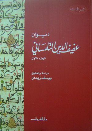 ديوان عفيف الدين التلمساني حققه المحقق المعروف والروائي د.يوسف زيدان وصدر هذا الأسبوع عن دار الشروق والذي استهله بتمهيد أكد فيه أن شعر الصوفية نال قسطا وافرا من إهمال دارسي التصوف لوقوعه في دائرة الأدب ومن إهمال دارسي الأدب لوقوعه في دائرة التصوف، وقال إنه بين الدائرتين بقي شعر التصوف على ما فيه من روعة بعيدا من الأعين التي مهما بحثت في زواج المكتبة العربية فلن تجد إلا أقل القليل من دواوين الشعر الصوفي، فالمحقق منها لا يزيد علي أصابع اليد الواحدة والدراسات الجادة حولها لا يزيد عددها على أصابع اليد الأخرى.