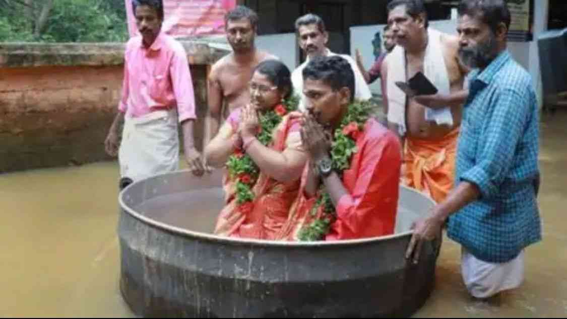 نيودلهي: جاب عروسان هنديان شوارع غمرتها المياه بسبب الفيضانات في ولاية كيرالا جنوب الهند، داخل إناء طهي ضخم الاثنين للوصول إلى مكان زفافهما.