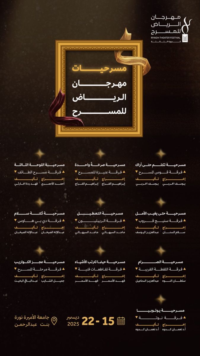 إيلاف من الرياض: كشفت هيئة المسرح والفنون الأدائية عن قائمة العروض المسرحية المتأهلة للمشاركة في الدورة الثالثة من مهرجان الرياض للمسرح، المقرر إقامته في الفترة من 15 إلى 22 كانون الأول (ديسمبر) المقبل، وذلك في مركز المؤتمرات بجامعة الأميرة نورة بنت عبدالرحمن في مدينة الرياض.