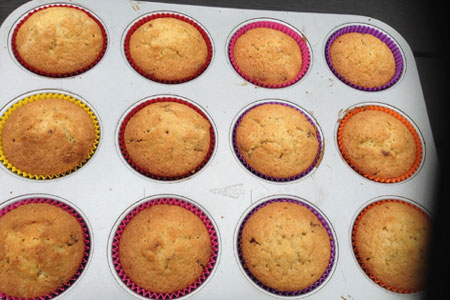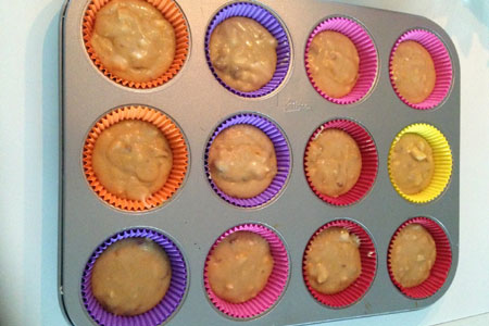 ضعي الأوراق في صينية القوالب المخصصة لخبز&أشكال الكعك وصبّي&العجين بعناية في كل&قالب. وعليك التأكد من ملء القالب فقط&حتى النصف.&ثم ضعي صينية القوالب قليلاً&على بلاط مسطحة حتى تملس العجينة في القوالب دون تعرجات.