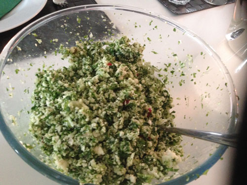 - في غضون ذلك ضعوا الخُضَر في الخلاط حتى يصبح حجمهم كحبيبات الكسكس تقريباً، لكن لا تحولوهم لهريس. ويُنصَح بخلط الأعشاب بشكلٍ منفصل عن البصل الأخضر والقرنبيط من أجل تناسق المواد.