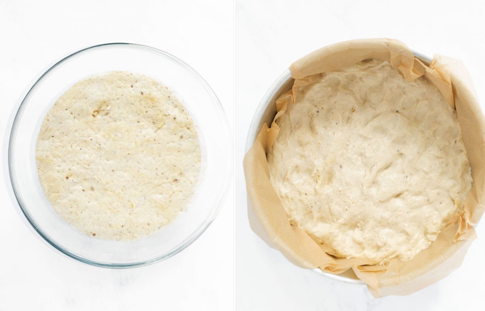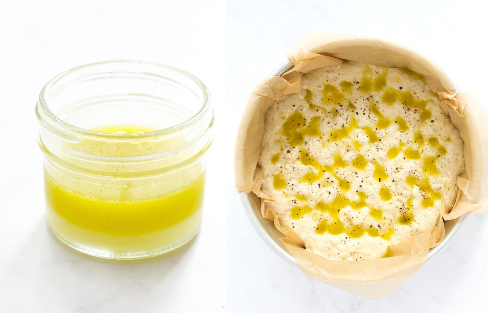 - يُمزج الدقيق، والملح، والفلفل الأسود، والخميرة في وعاء كبير. يضاف اليهم الماء وزيت الزيتون مع خلطهم لدمج الدقيق، يخلط حتى لا يتبقى أي دقيق جاف، وتصبح الكتل ناعمة تمامًا.