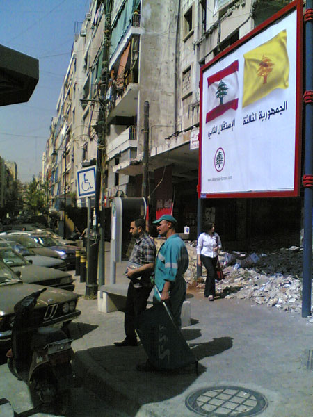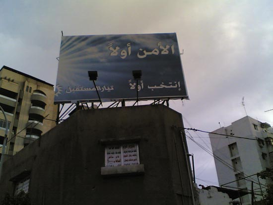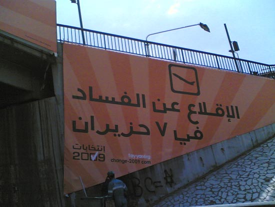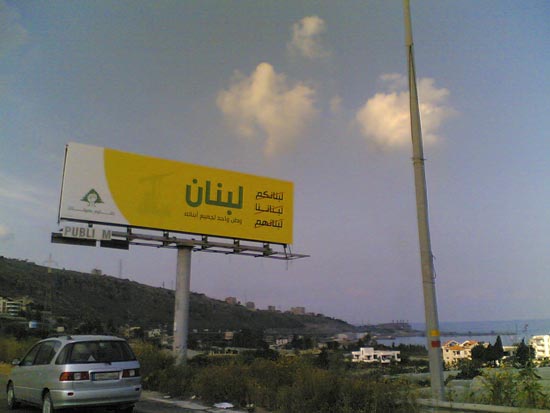 ترفع الأحزاب والقوى بمرشحيها الشعارات الإنتخابية فوق الطرقات فتتلوّن اللوحات الإعلانية بالبرتقالي والأصفر والأخضر والأزرق والأحمر والأبيض. وتنتصب الكلمات فوقها واعدة بالـquot;مستقبلquot;، والـquot;أملquot; وquot;الجمهورية الثالثةquot;، وquot;ووطن واحد لجميع أبنائهquot;، والإستقلال الثانيquot;...