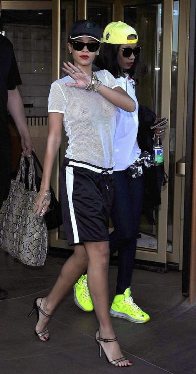 إختارت نجمة البوب الشهيرة ريهانا إرتداء سروال قصير وقبعة بيسبول من مجموعة روبيرتو كافالي الرياضية يوم الإثنين 22 تموز/يوليو 2013 في ستوكهولم.