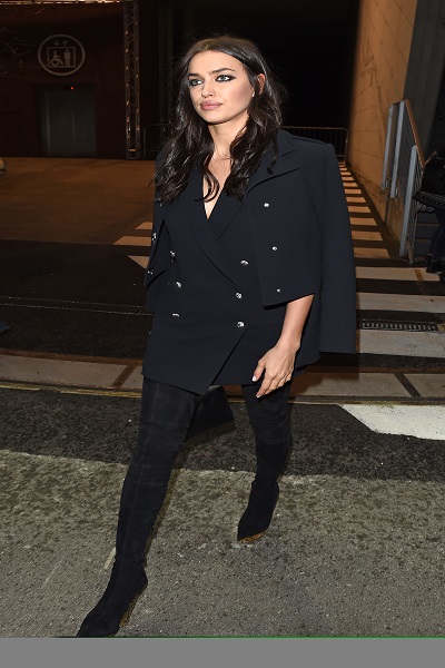 - ايرينا شايك : ظهرت بفستان مزود بأزرار كما أزرار السترات وحذاء أسود فوق الرقبة مزود بتفاصيل ذهبية في الكعب وحقيبة كتف مميزة خلال ظهورها بأسبوع ميلانو.