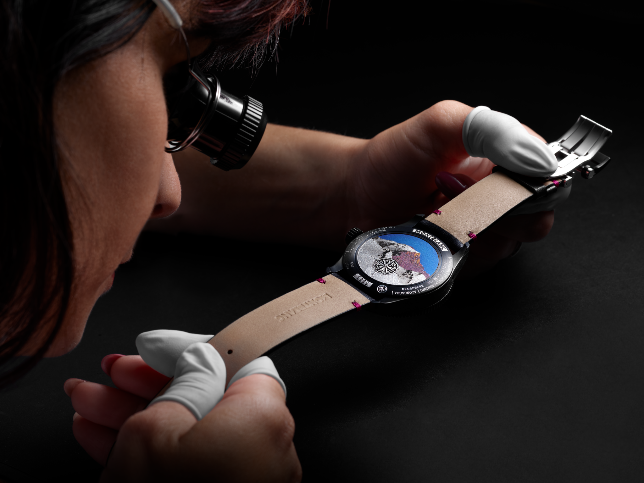 وتكريماً لمشروع The Pink Dial، يكشف الجزء الخلفي من الساعة رسماً ثلاثي الأبعاد لغروب الشمس باللون الوردي منعكساً على وجه جبل مون بلان الشهير. وتم إنشاء هذا المشهد الواقعي باستخدام تقنية نقش خاصة جداً بالليزر، ليبدو وكأنه صورة فوتوغرافية تقريباً.