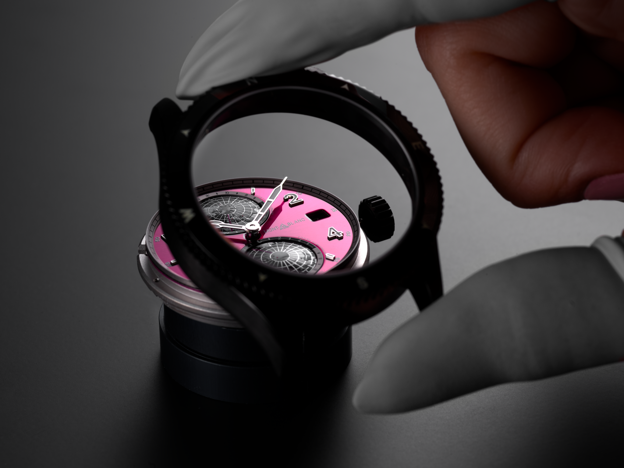 يتناقض الميناء ذو اللون الوردي الفوشيا مع علبة من التيتانيوم الأسود الداكن بقياس 42 مم، والتي يتم تصنيعها باستخدام معالجة الكربون الألماسي (DLC)، حيث يوصف لونها بـ "أسود 4"، وتعني "أسود جداً" – بأقصى درجة من السواد. ويتم نفخ الكرات الزجاجية الصغيرة تحت ضغط عالٍ لإعطاء المعدن قواماً مجهرياً بحيث يمكن لطلاء الكربون الألماسي أن يلتصق به بشكل لا ينفصم تقريباً، مما ينتج عنه ملمساً ناعماً وغير لامع على السطح.