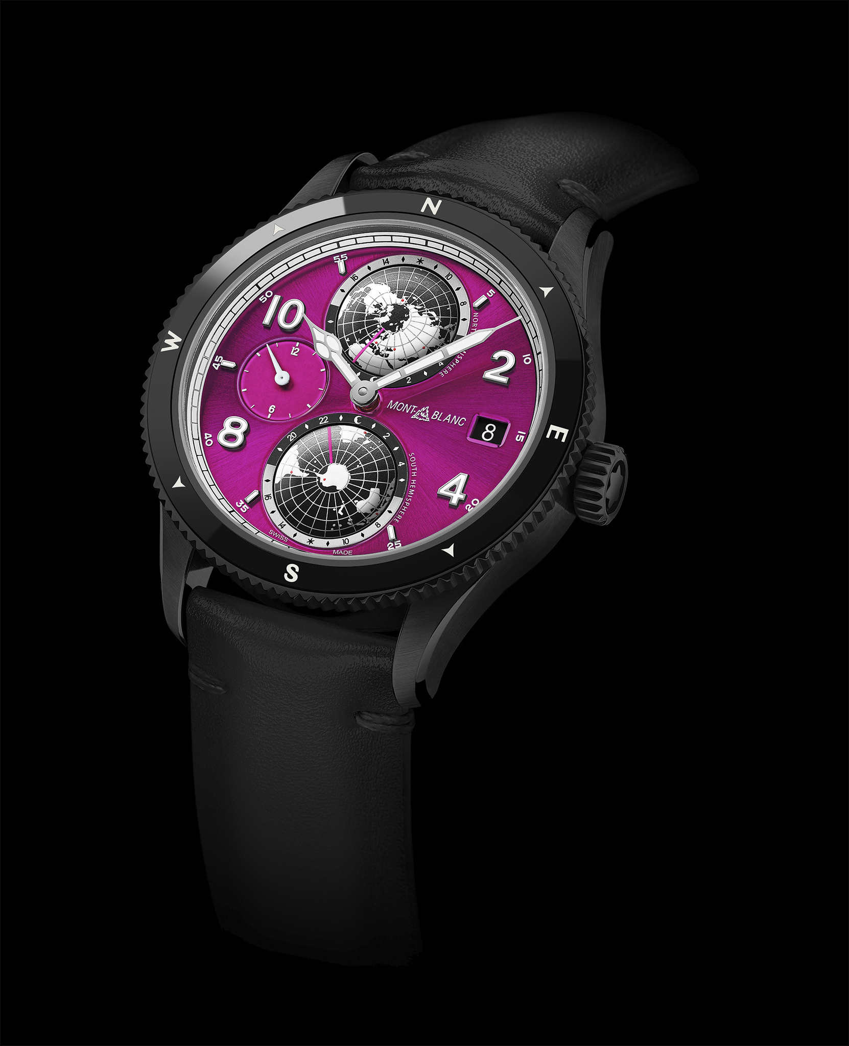 من وحي اللون الوردي الذي يرمز إلى مكافحة سرطان الثدي، اختار مصممو "مون بلان" قرصاً ملوناً بالوردي الفوشيا المذهل واللامع، مع طلاء بنمط أشعة الشمس، مما يضفي على الساعة مظهراً جذاباً وبارزاً. وباستخدام مادة سوبر لومينوفا®، تتألق باللون الأزرق كل من مؤشرات البوصلة على الحلقة الخارجية، والأرقام العربية، والمؤشرات، والقرصين الكرويين، بينما تظهر الساعات والدقائق والثواني والمنطقة الزمنية الثانية باللون الأخضر المتوهج – مما يوفر جماليات جذابة وساطعة، مع مزايا عالية للقراءة بوضوح.