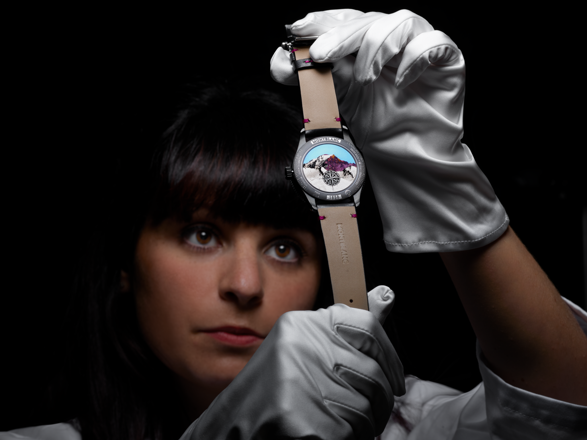 وتم تجميع هذه الساعة الخاصة جداً من قبل صانع لساعات المرأة لدى "مون بلان"، وهي مصنوعة من تيتانيوم الكربون الألماسي باللون الأسود مع قرص باللون الوردي الفوشيا، وسيتم بيعها بالمزاد في شهر أكتوبر.