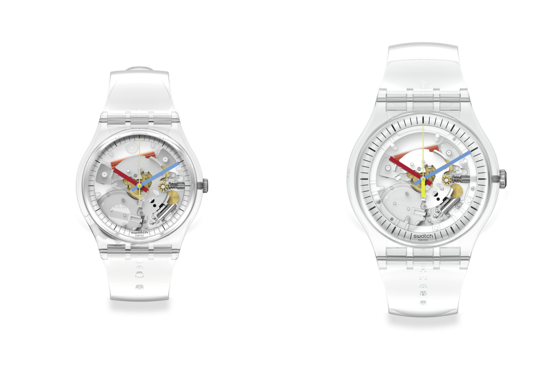 وSwatch كانت سباقة في هذا التوجه عندما أطلقت تصميمها الشفاف للمرة الأولى في ساعة Gent في عام 1985. ولكن هذه المرة، تعود مع خمسة تصاميم تشمل مختلف المقاسات لمجموعات العلامة التجارية.