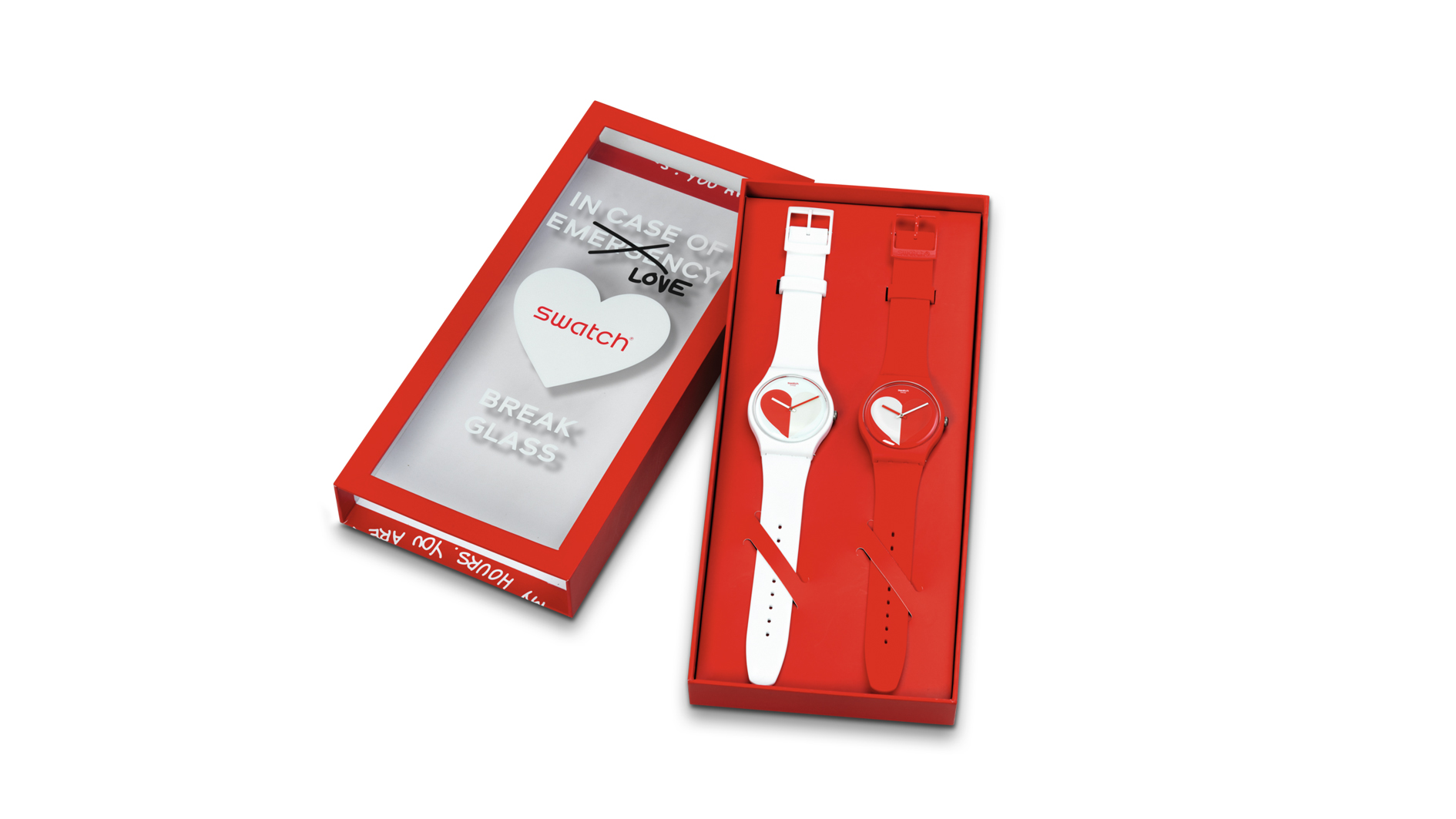 العلبة والزجاج والإبزيم في كلا الساعتين مصنوعة من مواد مشتقة من مصادر حيوية. وتضع Swatch لمستها المبهجة من خلال قلوب تضيء في الظلام على قرصي الساعتين، وغلاف مزين بعبارة "افتح الصندوق إذا كنت متيّماً".