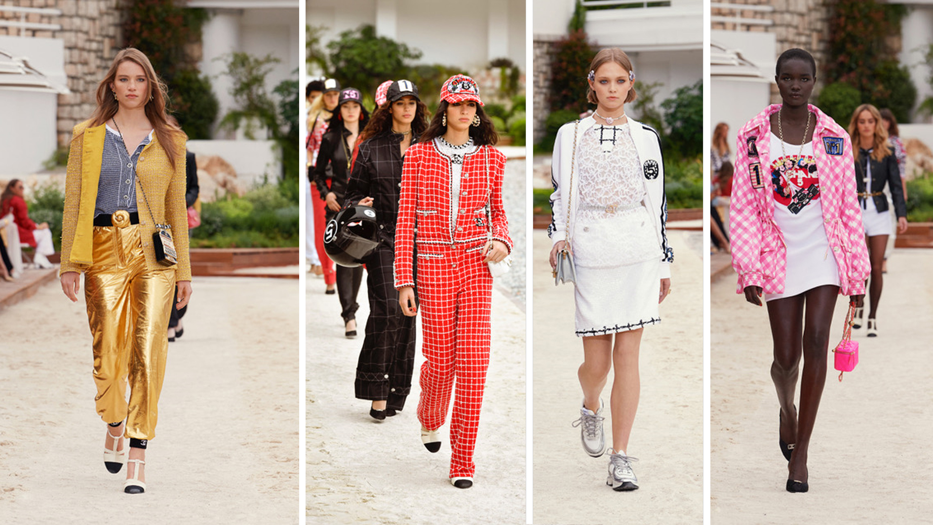 جو رياضي ، وهناك أيضاً أفرول تويد أو حرير مبطن بقطعة قماش تيري خفيفة. العديد من الترتر والزهور تشكل بلوزات مطرزة تزين الفساتين الطويلة المخططة الرفيعة ذات الياقات البيضاء العالية - في إشارة إلى كارل - ، فستان أزرق منتصف الليل مطرز ، أو بلايز بدون ظهر تلبس فوق سراويل واسعة ".