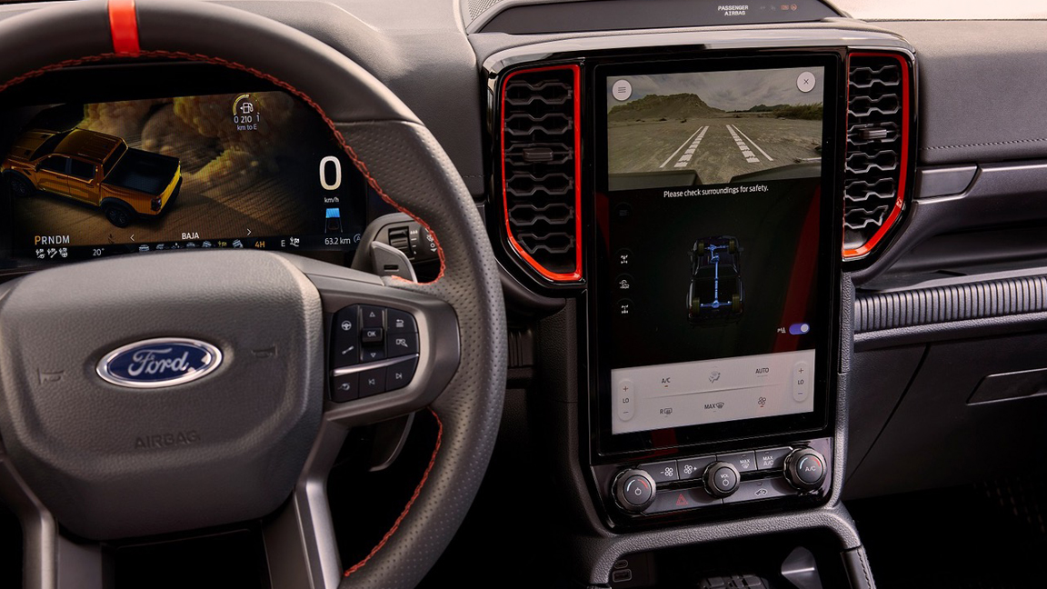 ويمتد التميز في خيارات التخصيص الفردية لرينجر رابتر إلى شاشة المعلومات الخاصة بالسائق قياس 12 بوصة، والتي يمكن تخصيصها بالكامل لتناسب مجموعة من أنماط القيادة. كما توفر الشاشة المركزية بقياس 12.8 بوصة رؤية محسّنة من خلال عرض صور متعددة للكاميرا، وتوفر قدرة أفضل على المناورة في المساحات الضيقة من خلال ميزات الرؤية بعين الطائر وكاميرا 360 درجة وعرض من الأعلى إلى الأسفل وعرض خطاف المقطورة الخلفية.