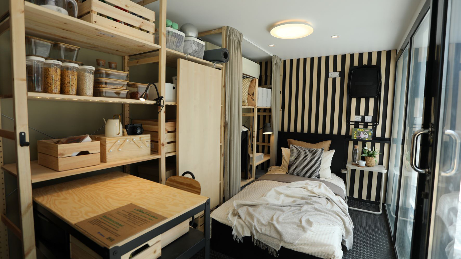 حاوية حلول المعيشة المستدامة التي تعرض منزل بمساحة 15 متر مربع، يقدم نظرة عامة واضحة، مما يقلّل من هدر الطعام والمياه والطاقة ويخفف الكثير من التكاليف. ويمكن لزوار حاوية الاستدامة التعرّف على طرقٍ عملية ومتنوعة للحفاظ على الكوكب بما فيها زراعة النباتات والخضروات في المنزل بجوار النوافذ لتقليل الانبعاثات الناجمة عن وسائل النقل والحدّ من أثرها السلبي على البيئة، بالإضافة إلى استخدام المياه الباردة التي لا يتم استخدامها عند تشغيل صنبور الاستحمام في ريّ النباتات وتجفيف الملابس بالهواء بعد الغسيل للتقليل من استهلاك المياه والطاقة.