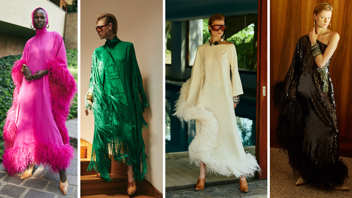 تصبح الصورة الظلية أكثر أناقة ودرامية بفضل القفطان المغطى والبلوزات والفساتين ذات التأثير الكبير المصنوعة من الحرير الكريبوني. ريش وأهداب مميزة مزينة بقفطان بطول كامل من قماش الكريب وفساتين صغيرة مصنوعة من جاكار لوريكس لامع.