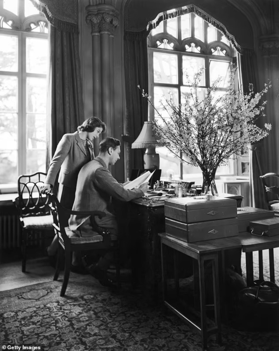 الأميرة إليزابيث تراقب والدها الملك جورج السادس على مكتبه في النزل الملكي عام 1942