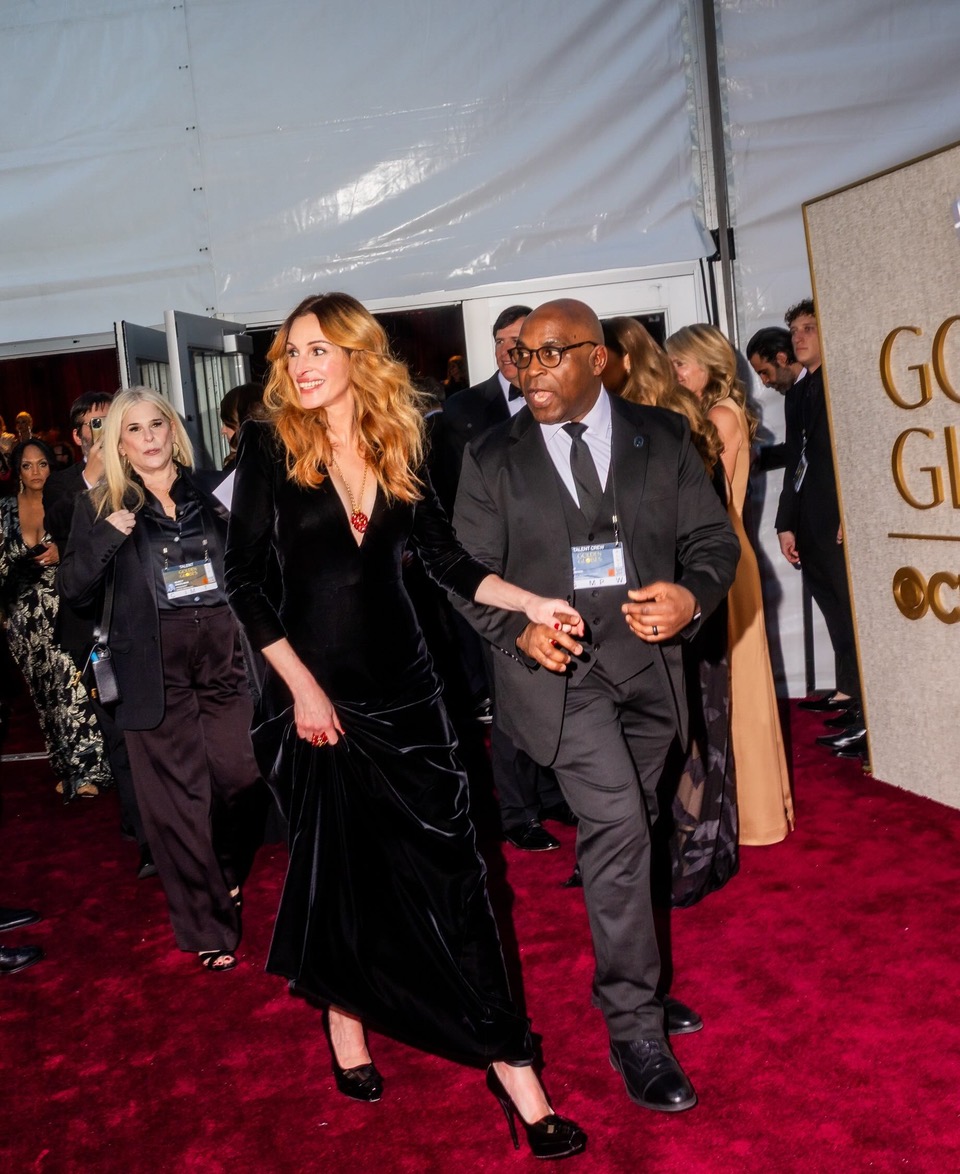 جوليا روبرتس اختارت فستانًا أسود من المخمل مع منصات روجر فيفييه.