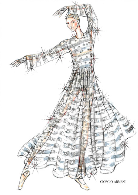 أزياء أرماني لا تنافس الرقص، بل تتنفس معه. أقمشة حريرية خفيفة كهمسة، خطوط انسيابية، ولوحة ألوان مستوحاة من ضوء القمر، عاجي هادئ، رمادي ناعم، وأزرق ليلي عميق، تنزلق عبر الخشبة، تلتقط الضوء مع كل دوران. القصّات دقيقة لكنها شاعرية، تنحت الجسد دون أن تقيده. كل إطلالة تصبح دراسة متقنة في التوازن: بين الذكوري والأنثوي، القوة والنعومة، التقاليد والرقي المعاصر.