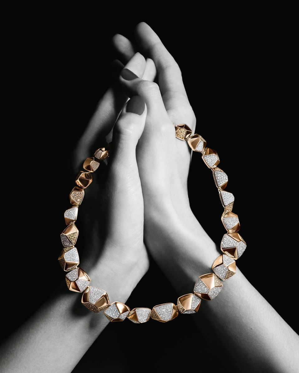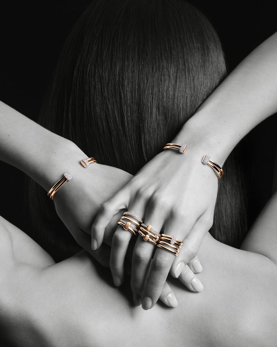وتبرز في الحملة أيقونات الدار الشهيرة، بدءاً من مجموعة "نودو" (Nudo) التي تكسر حدة المشهد الأحادي بألوان أحجارها النابضة، مروراً بمجموعة "إيكونيكا" (Iconica) و"كاتيني" (Catene) اللتين تقدمان الذهب كمنحوتات انسيابية تلتف حول المعصم، وصولاً إلى "بوميلاتو توغيدر" (Pomellato Together) التي تعبر عن الروابط الإنسانية بأبسط الأشكال وأكثرها عمقاً. كما تسجل مجموعة "بينتاغوني" (Pentagoni) حضوراً لافتاً بتصاميمها الهندسية الجريئة التي تحاكي العمارة الحديثة.