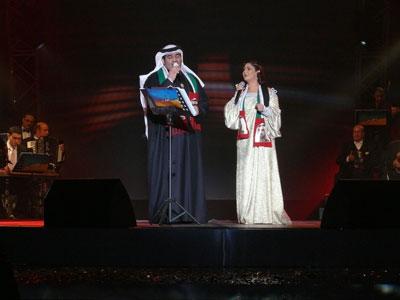 ثم عادت نوال عودتها الى المسرح لغناء quot;ديوquot; مع الفنان حسين الجسمي الذي رحب بها كثيرًا قائلاً: quot;شرفني حضورك معي على المسرح والغناء معيquot;، ليقدما أغنية quot;بكيتكquot;، قبل أن يعاود الجسمي وصلته منفردًا فغنى الأغنية المصرية quot;قول رجعت ليهquot;، ثم quot;شموخيquot; وquot;بلغ حبيبكquot;، كما غنى للسيدة فيروز أغنية quot;حبيتك تنسيت النومquot; التي تفاعل معها الجمهور الذي لم يجلس على مقاعدة طيلة الحفل.