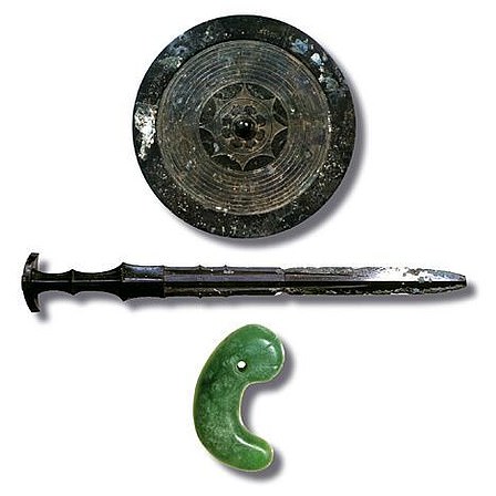 والرموز المقدسة التي كانت اتخذتها العائلة الإمبراطورية في اليابان منذ القدم للتعبير عن قوتها حيث لا يوجد في اليابان تاج إمبراطوري، تمثل الفضائل الأساسية الثلاث: الشجاعة (السيف) ، والحكمة (المرآة) ، والخير (الجوهرة).