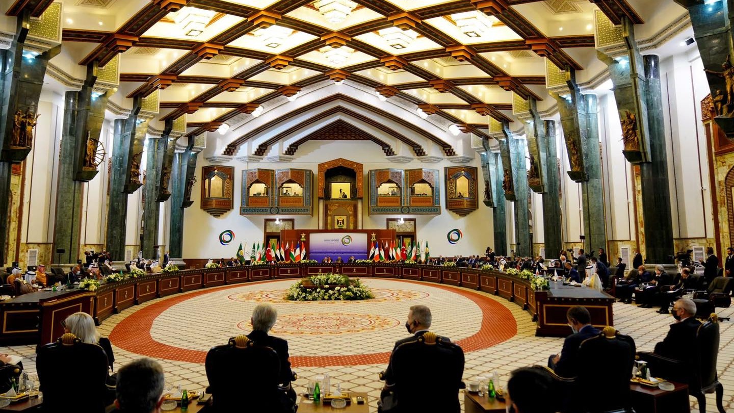 وشهد المؤتمر جلستين علنية ومغلقة وافتتحه رئيس وزراء الدولة المضيفة مصطفى الكاظمي بالتأكيد على انه لا عودة للماضي أو للعلاقات المتوترة والحروب العبثية مع الجيران والأصدقاء .
