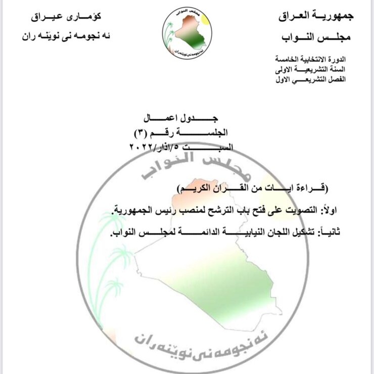 فقد اعلنت رئاسة البرلمان العراقي في وقت متأخر من مساء الاربعاء في بيان تابعته "ايلاف" عن عقد جلسة ثالثة لمجلس النواب في دورته الخامسة الجديدة التي افرزتها الانتخابات المبكرة التي جرت في العاشر من تشرين الاول اكتوبر الماضي حددت لها الساعة الحادية عشرة بالتوقيت المحلي (الثامنة صباحا بتوقيت غرنيتش).