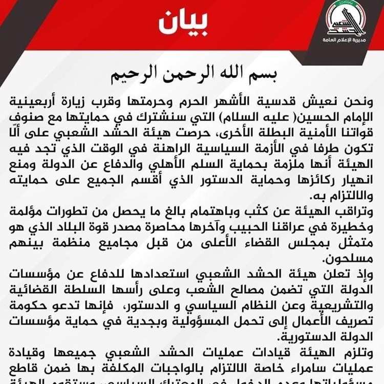 وشددت على استعدادها للدفاع عن مؤسسات الدولة وعلى رأسها السلطة القضائية والتشريعية وعن النظام السياسي و الدستور.. وانتقدت حكومة الكاظمي قائلة إنها "تدعو حكومة تصريف الأعمال إلى تحمل المسؤولية وبجدية في حماية مؤسسات الدولة الدستورية".
