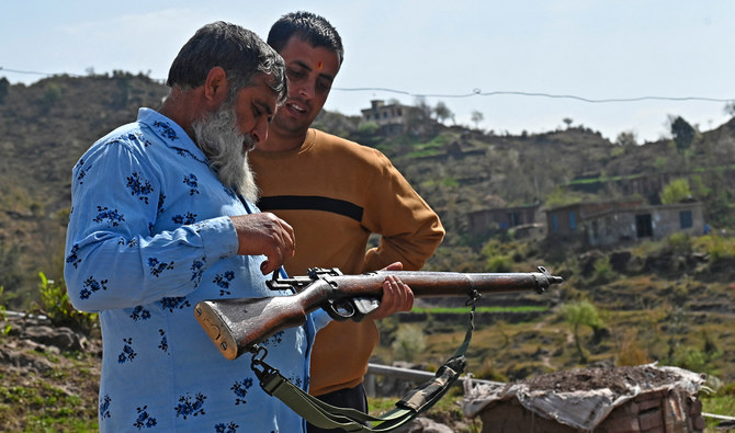 صورة التُقِطَت في 26 شباط\ فبراير 2023 تُظهِر الموظف المدني سانجيت كومار (يمين) يتابع تعليمات استخدام السلاح مع جندي متقاعد من الجيش الهندي عبد القيوم في قرية دانجري في كشمير الخاضعة للإدارة الهندية.
