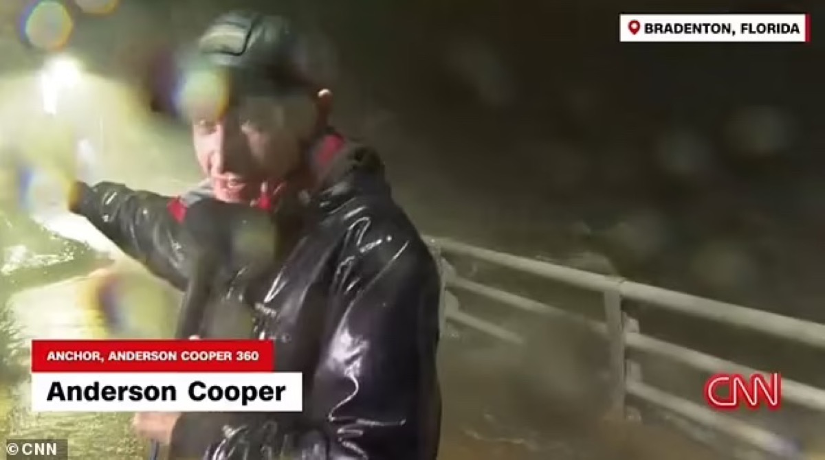 إيلاف من دبي: أصيب المراسل التلفزيوني أندرسون كوبر أثناء تغطيته لإعصار ميلتون على الهواء مباشرة لصالح شبكة CNN، بعد اصطدام قطعة من الحطام بوجهه خلال نقل مباشر من برادنتون، فلوريدا، الواقعة على بعد أميال قليلة من سييستا كي التي تعرضت للإعصار.