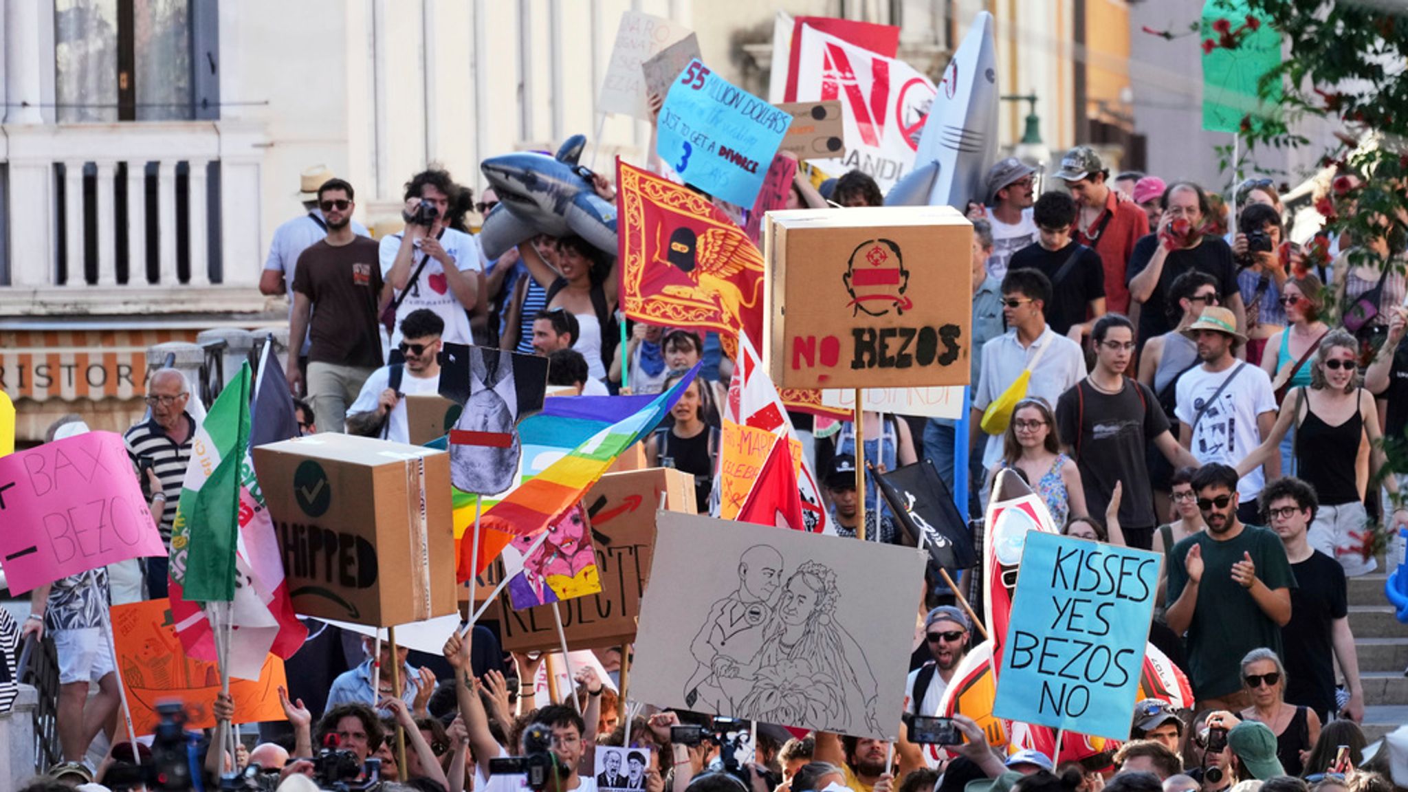 ويوم السبت، شوهد المتظاهرون وهم يحملون لافتات كُتب عليها: "قبلات نعم، بيزوس لا"، "لا بيزوس، لا للحرب"، و"أمازون دمرت 118 ألف متجر إيطالي". وتجمع آخرون على جسر ريالتو الشهير في المدينة، حيث رفعوا لافتة كُتب عليها: "لا مكان لبيزوس".