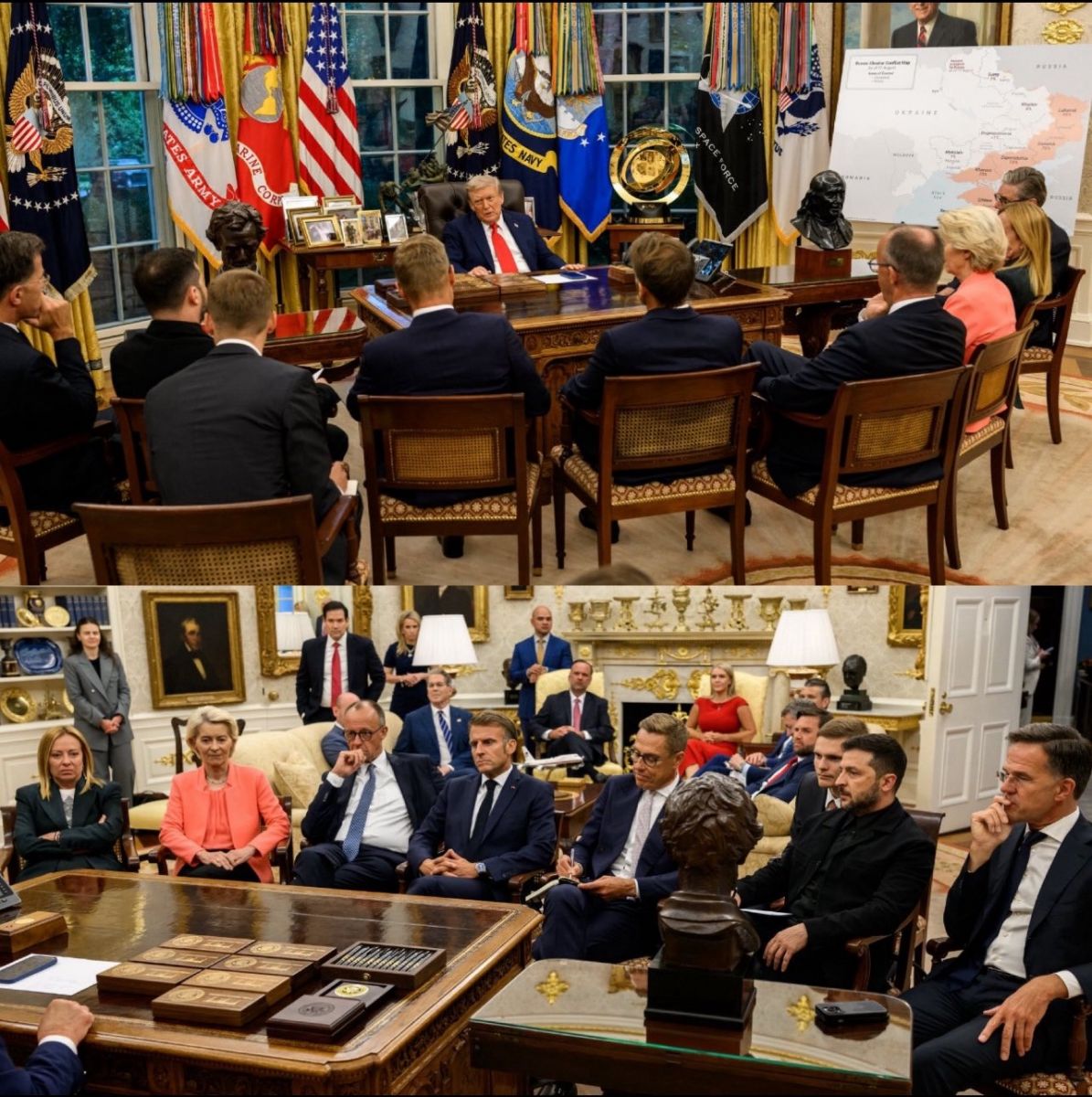 ومع ذلك، اعتبر بعض المراقبين الجيوسياسيين ومستخدمي الإنترنت على منصة X أن هذه الصورة التي نُشرت حديثًا والتي تُظهر القادة الأوروبيين جالسين أمام مكتب ترامب تشير إلى لحظة "إحراج وإذلال".