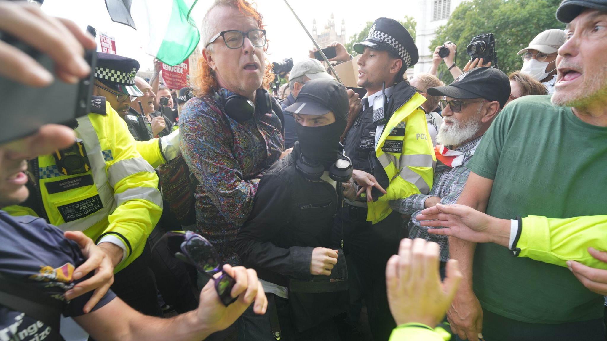 وتظاهر المحتجون في ساحة البرلمان في وستمنستر بعد ظهر دعماً للمنظمة الإرهابية المحظورة. وشوهد رجل يُقتاد من قبل الشرطة، بينما كان الحشد في ساحة البرلمان يهتف "عار عليك" و"أنت تدعم الإبادة الجماعية".