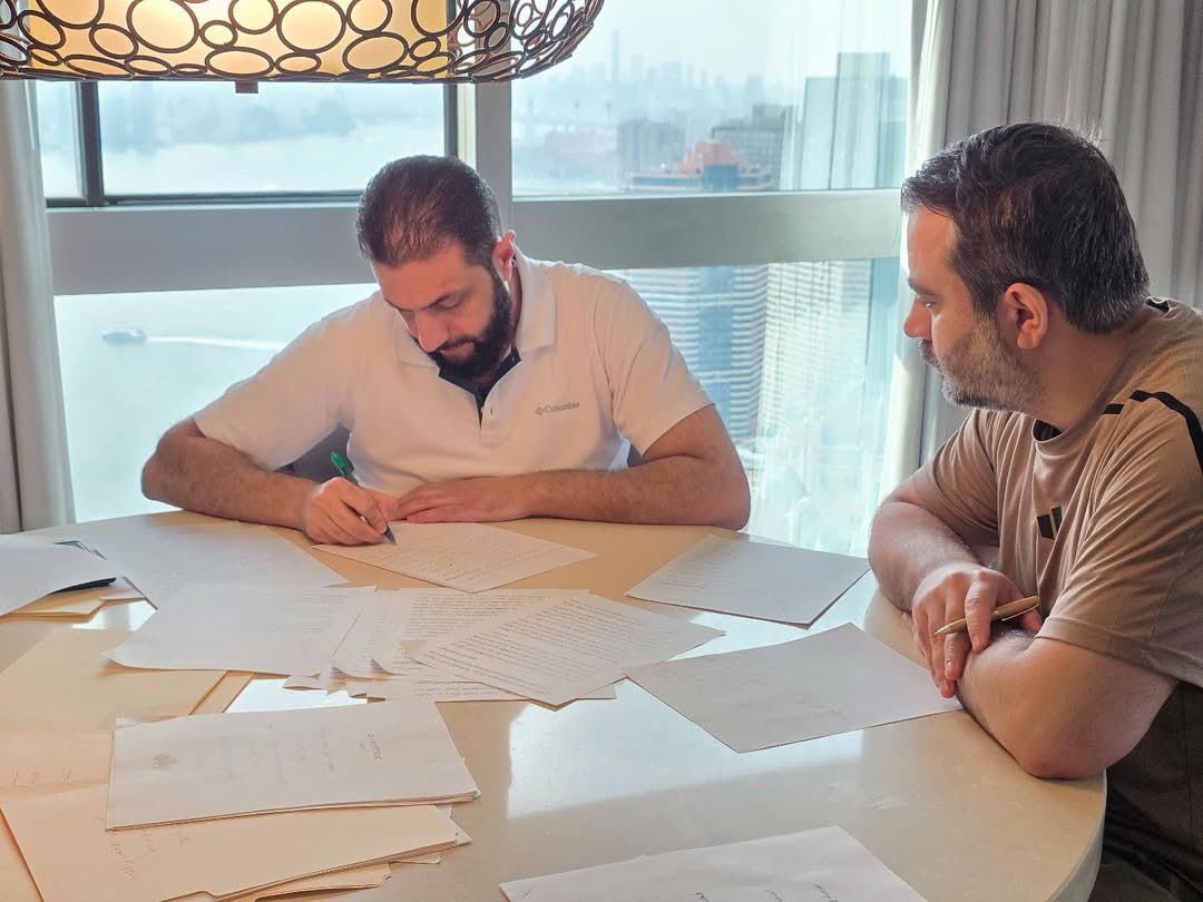(الشرع والشيباني أثناء تجهيز الخطاب)