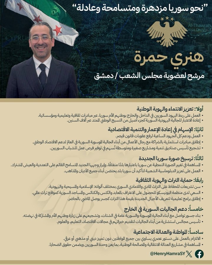إيلاف من واشنطن: أعلن هنري حمرا، وهو يهودي من أصل سوري مقيم في الولايات المتحدة، عن ترشحه لعضوية مجلس الشعب السوري عن دائرة دمشق. ومن المقرر إجراء الانتخابات في 5 أكتوبر (تشرين الأول).