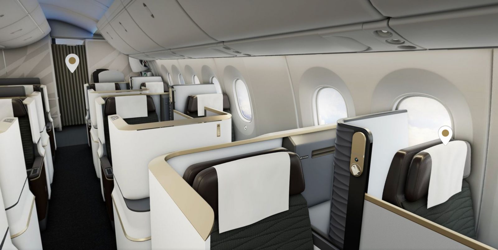 الطائرة التي سيتم استخدامها على خط البحرين-نيويورك، تم تكوينها بـ 26 مقعدًا في درجة رجال الأعمال في مقصورتها "الصقر الذهبي" و 256 مقعدًا في الدرجة الاقتصادية.