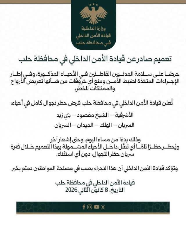 واعتبر أن "الملف المظلم في حلب بدأ يغلق بثبات الجيش السوري، وبجهود قوى الأمن الداخلي، وصبر وتعاون الأهالي. حلب تتقدم خطوة جديدة نحو الأمان والاستقرار".