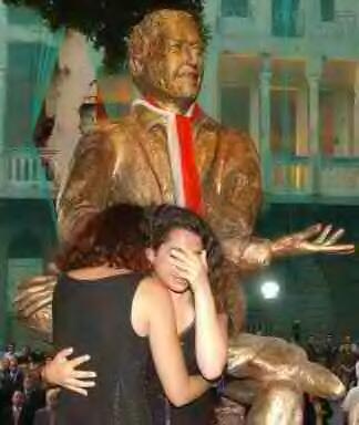 ابنتا سمير قصير أمام تمثاله في الحديقة التي تحمل اسمه