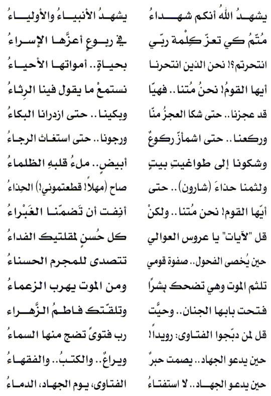 ففي قصيدته ( نص قصيدة الشهداء )، يمجّد فيها العمليات الانتحارية (في فلسطين) ،واشيع ان العلاقات مع لندن تدهورت بسبب ذلك .